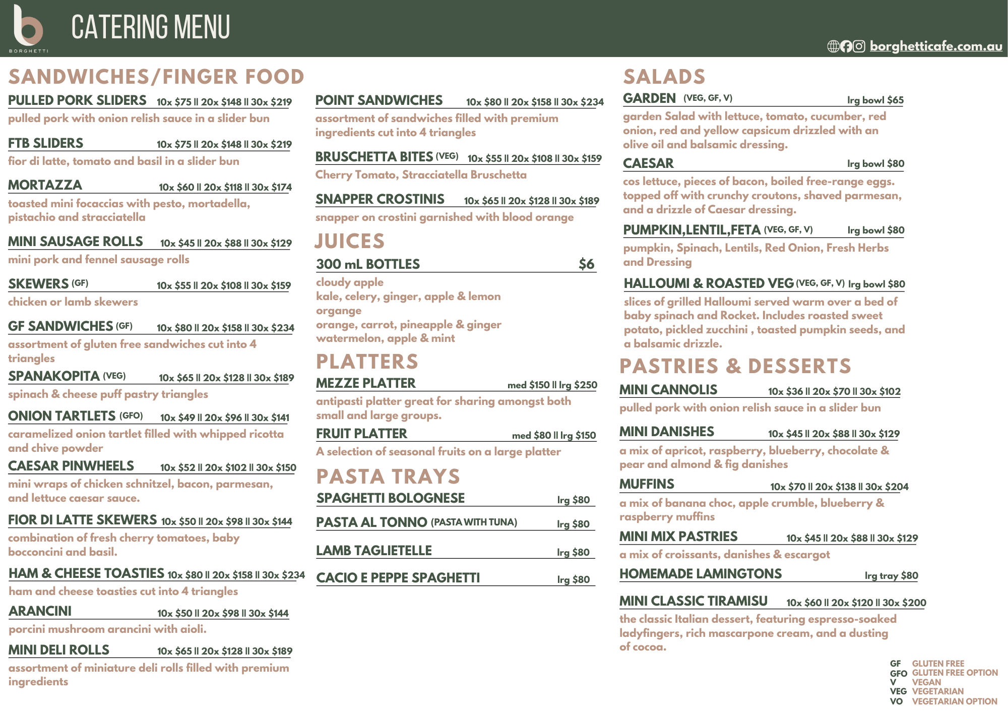 We specialize in providing delicious, high-quality food designed to impress your guests. To discuss your catering needs, explore our menu options, and receive a customized quote, please reach out to us today via emailing admin@borghetticafe.com.au
